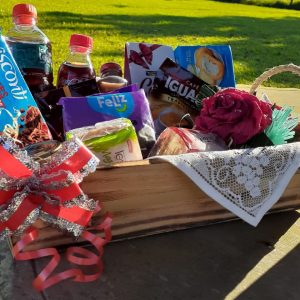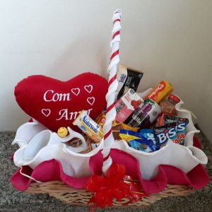 Cesta de Café Colonial em madeira com Coração de Pelúcia