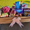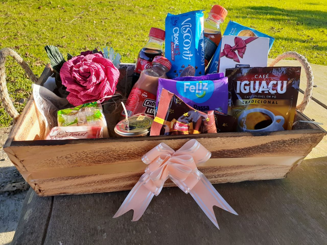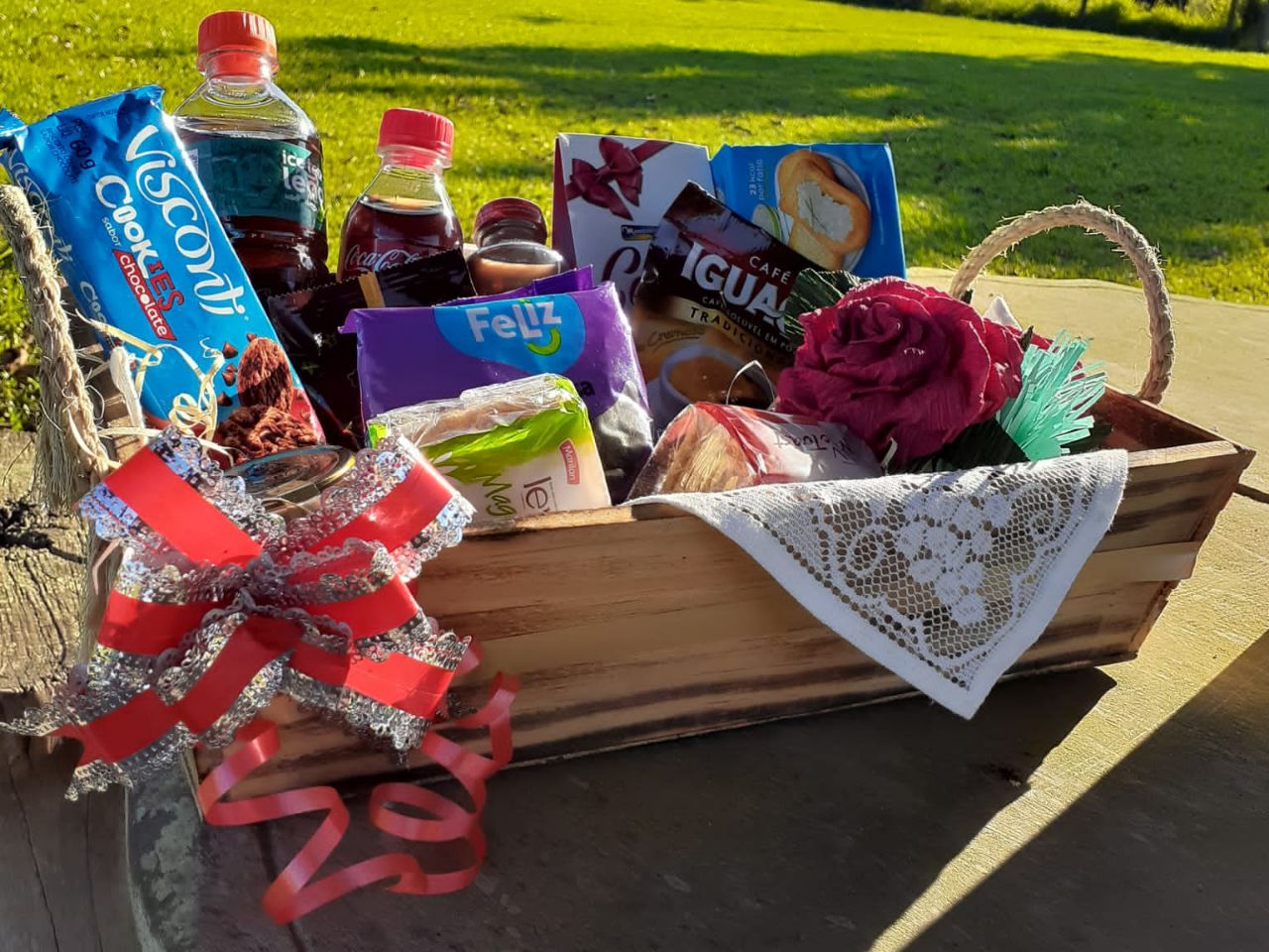 Contém: Bolachas coloniais, pão de milho, salame, queijo, geleia, café solúvel, chá gelado, paçoquinha, chocolate