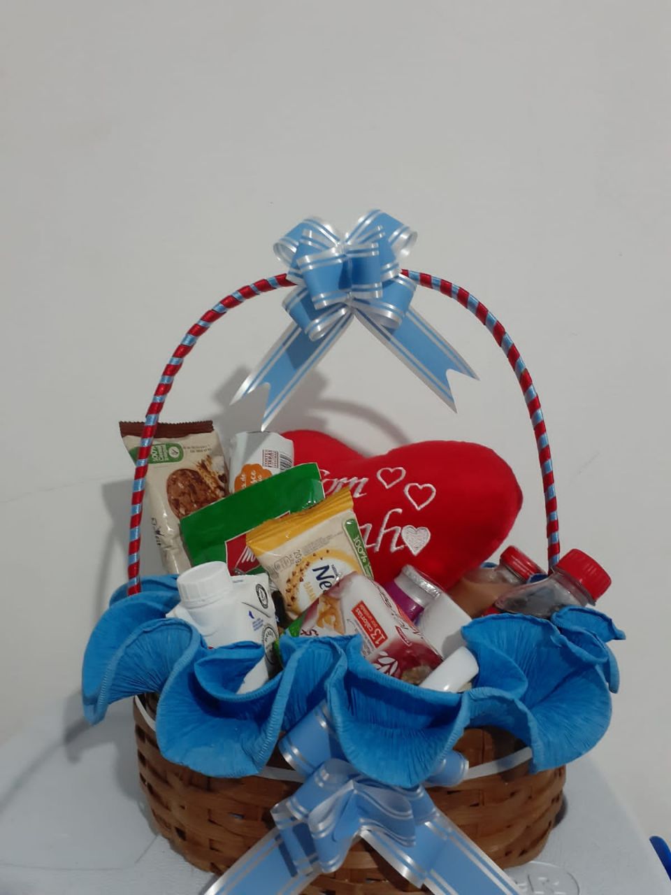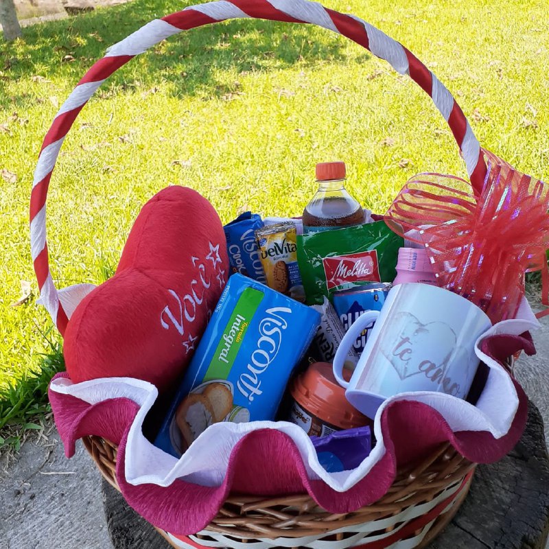 Contém: coração de pelúcia, caneca personalizada, torradas, bolachas doces e salgadas, geleia, chocolates, guloseimas, café, suco, achocolatado
