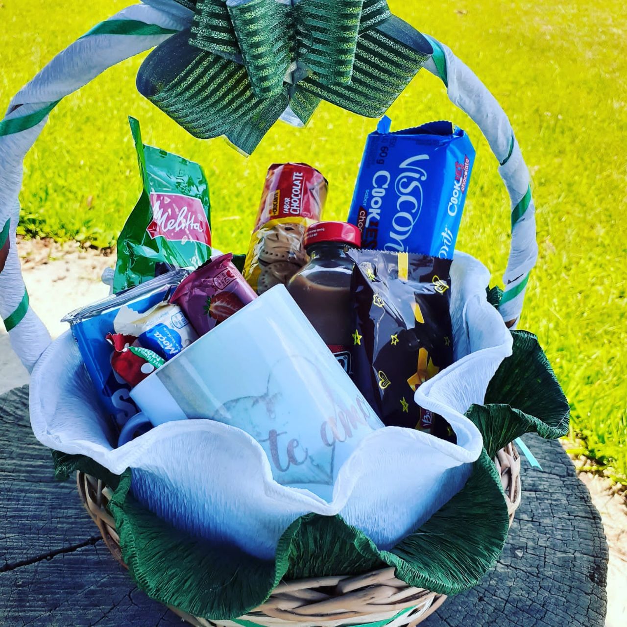 Contém: coração de pelúcia, torradas, bolachas doces e salgadas, geleia, chocolates, guloseimas, café, suco, achocolatado